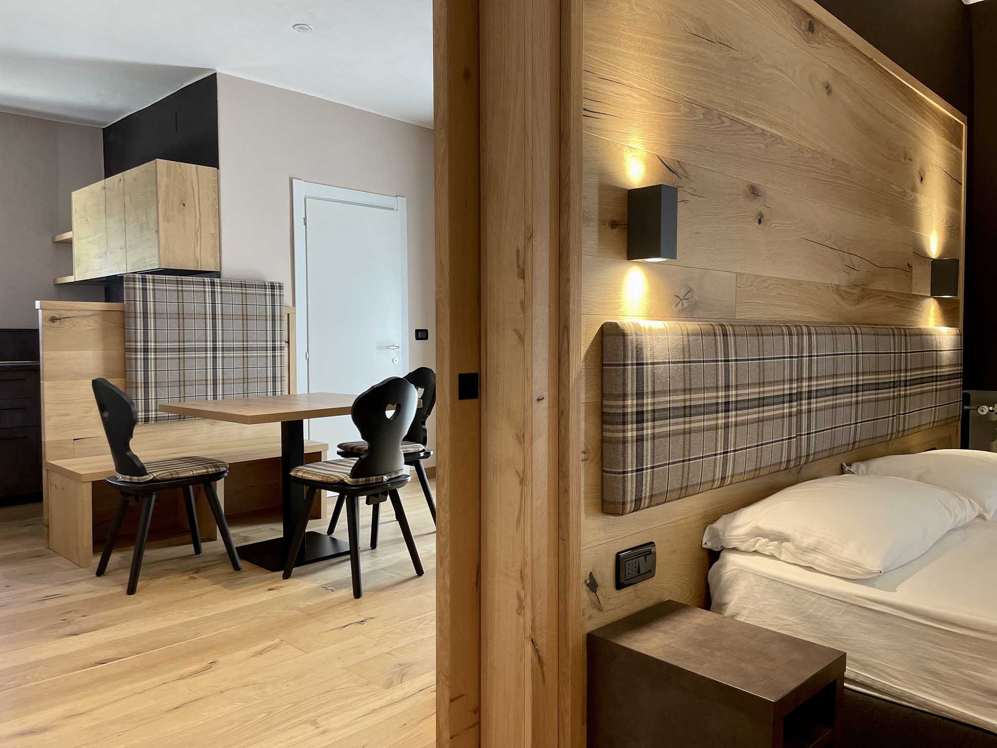Junior Suite DS of 50mq: consisting of sleeping area and living area equipped with sink, small fridge, table with chairs and sofa bed that can become a double bed, two bathrooms, some with balcony overlooking the garden.